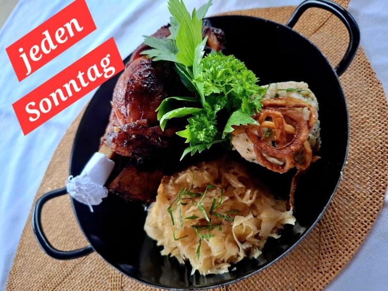 Ab sofort servieren wir Ihnen jeden Sonntag unsere ofenfrische Stelze mit Sauerkraut und Semmelknödel.